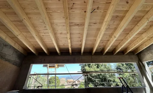 Pose de chape et travertin sur un toit d'une maison en construction à Ajaccio. Cette réalisation a été…