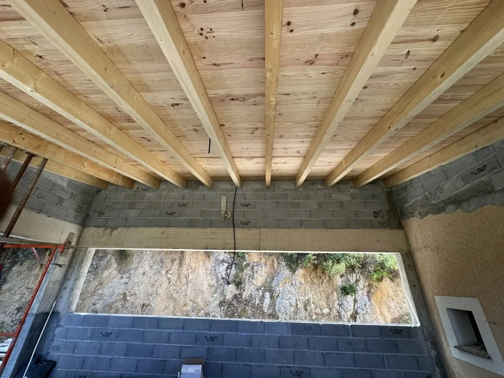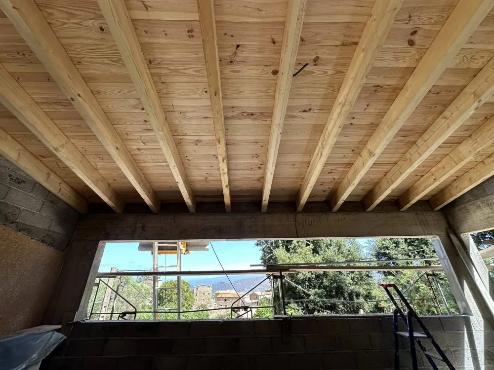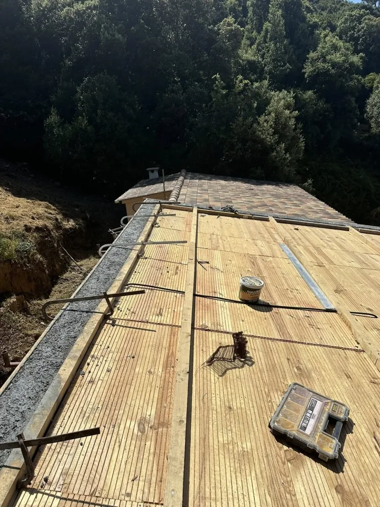 Envie de sublimer vos projets de construction ? Demandez dès maintenant un devis gratuit Pose de chape et travertin sur un toit d'une maison en construction à Ajaccio et profitez de l’expertise de Corse Moderne Rénovation.